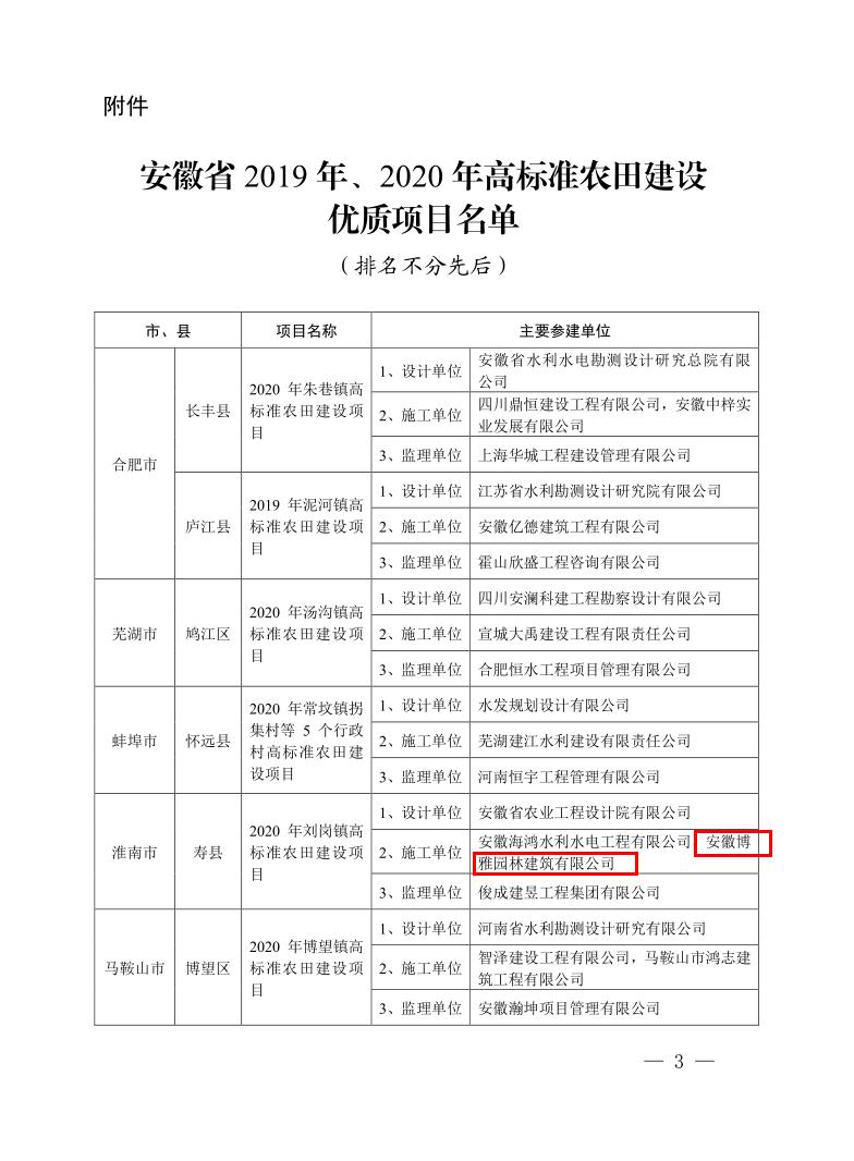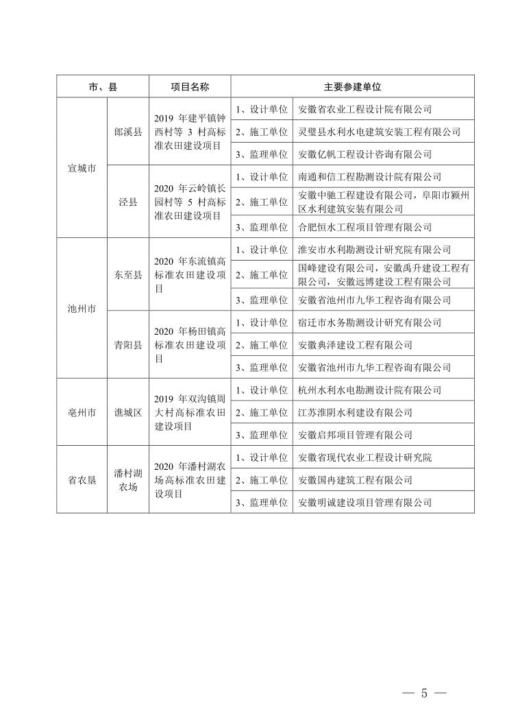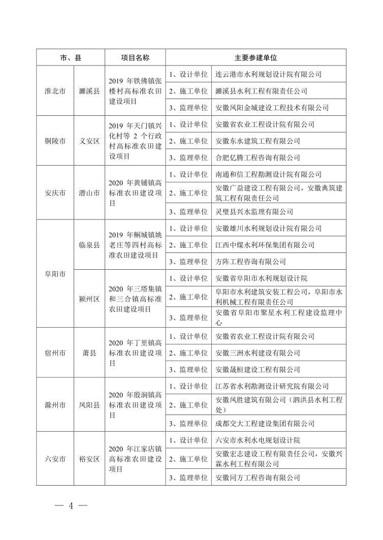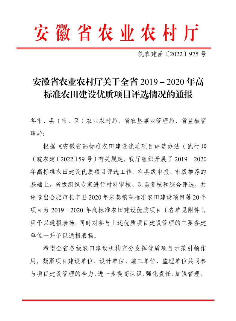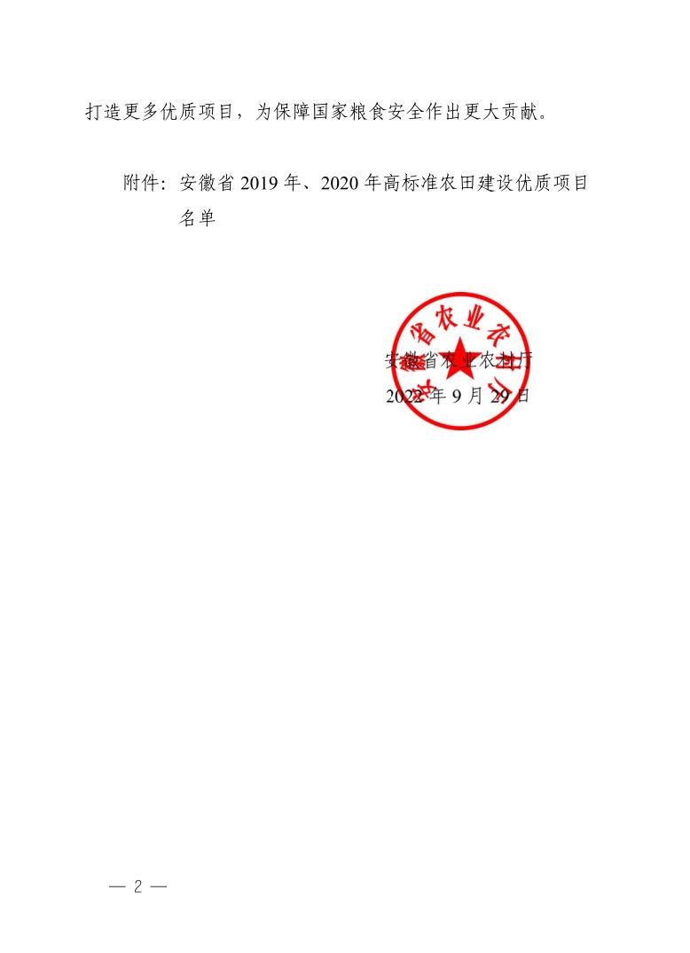 安徽省农业农村厅表彰:安徽省2019- 2020年高标准农田建设优质项目