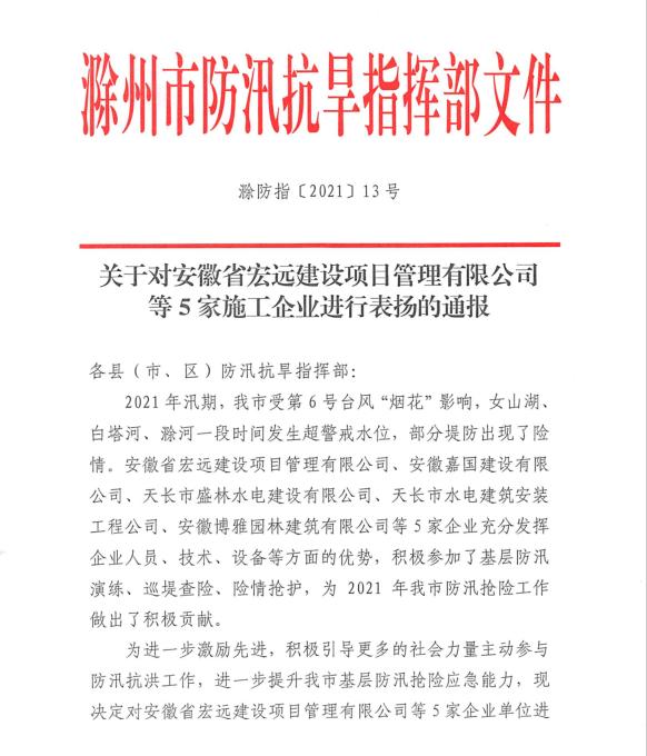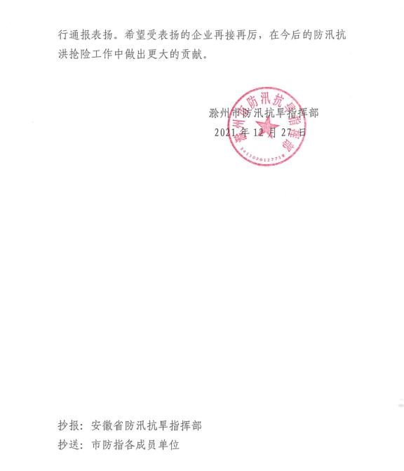 参加滁州市防汛抗旱工作,受到滁州市防汛抗旱指挥部表彰